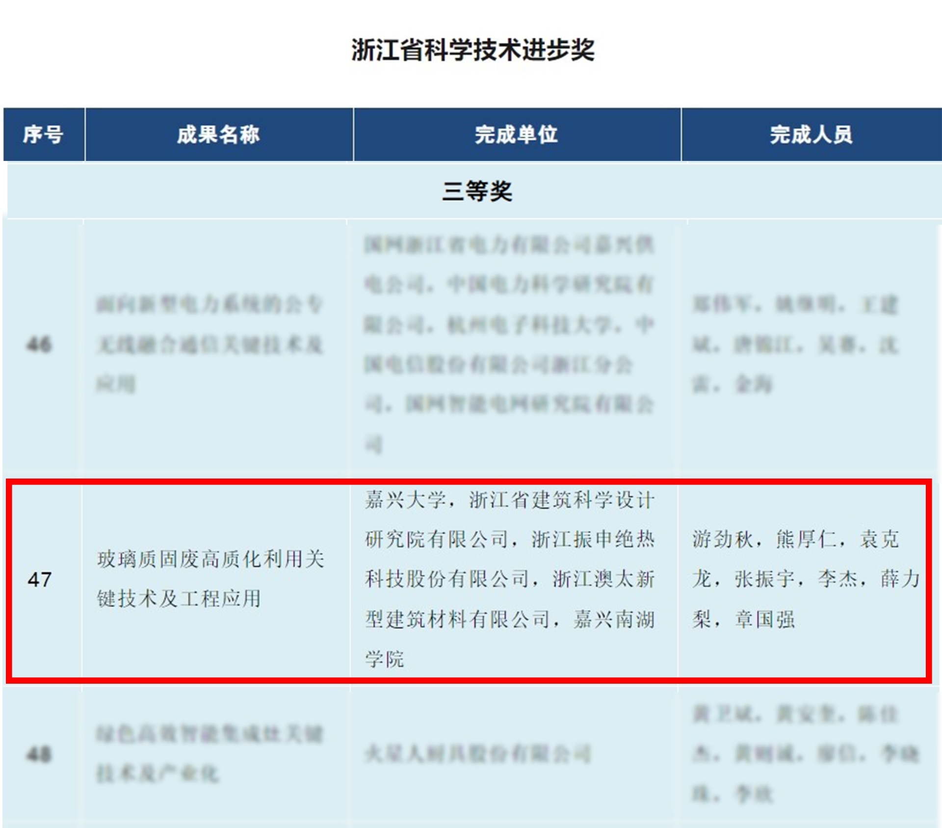 近日,加快建設(shè)創(chuàng)新浙江因地制宜發(fā)展新質(zhì)生產(chǎn)力動(dòng)員部署會(huì)暨全省科學(xué)技術(shù)獎(jiǎng)勵(lì)大會(huì)在杭州舉行,浙江振申絕熱科技股份有限公司《玻璃質(zhì)固廢高質(zhì)化利用關(guān)鍵技術(shù)及工程應(yīng)用》項(xiàng)目榮獲科學(xué)技術(shù)進(jìn)步獎(jiǎng)三等獎(jiǎng)。這是公司連續(xù)第三年獲得該獎(jiǎng)項(xiàng)。